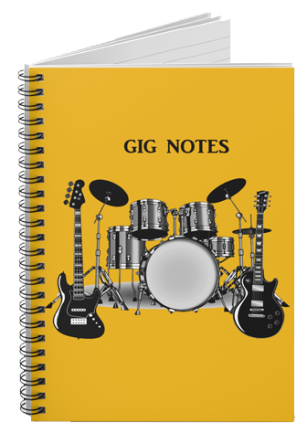 Every musician needs a compact notebook handy for jotting down set lists, band notes, new song chord progressions, gig dates or even to use as a journal. The "Gig Notes Notebook and Journal" is a 118 page spiral notebook with ruled line paper and is compact enough to fit perfect in your case, gig and gear bag or just to carry. The durable, instrument specific, printed cover makes the musician proud to carry it everywhere.
