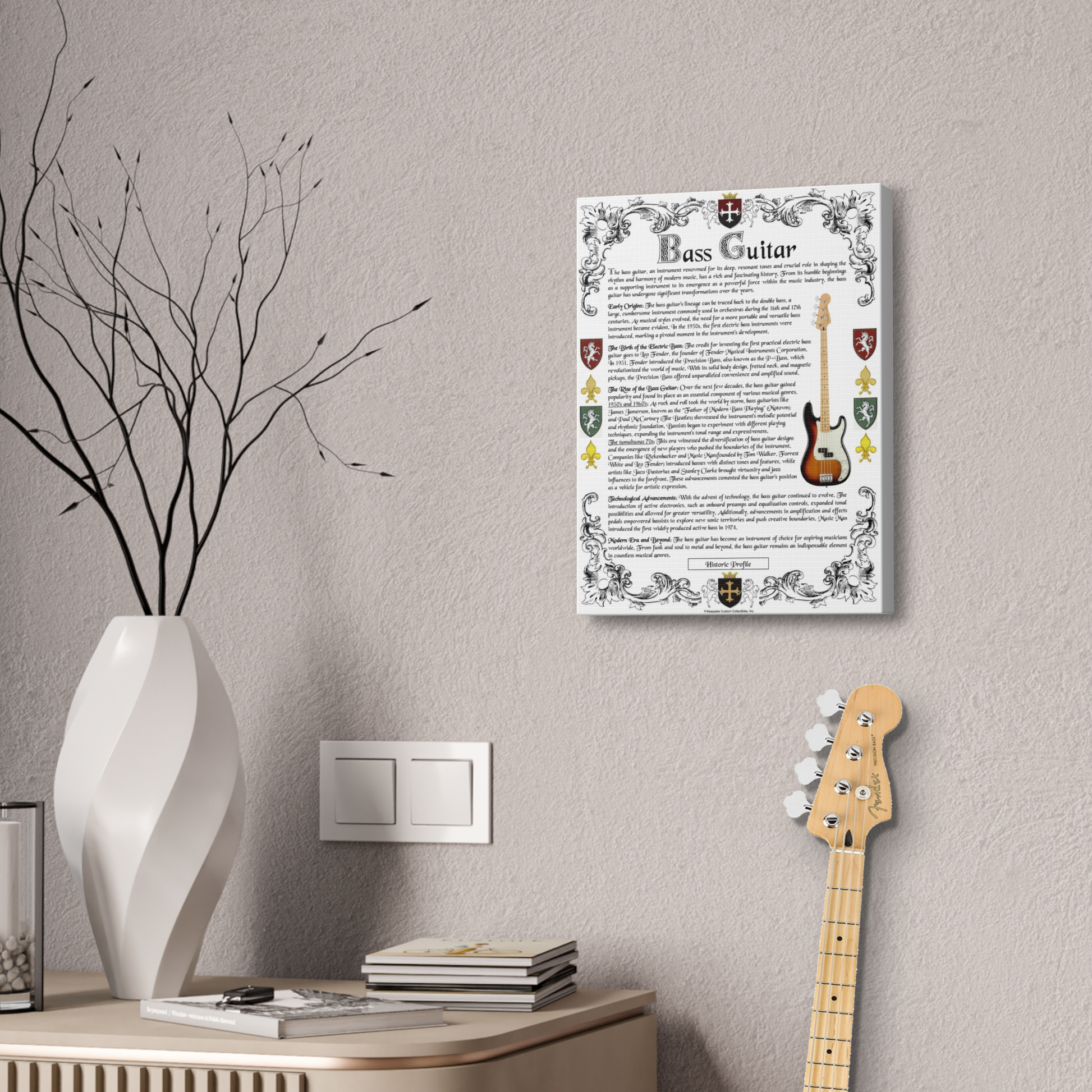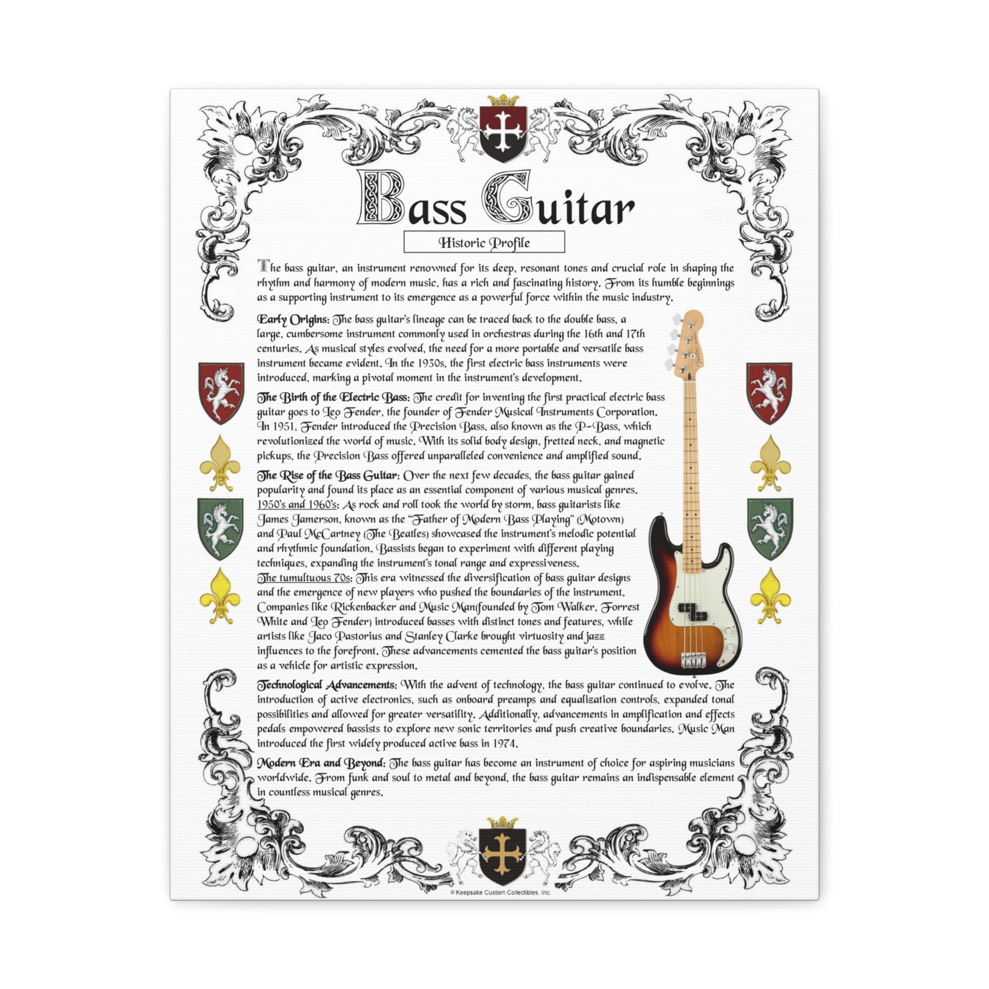 Uplift your music room, parlor, den, or home office decor by highlighting your passion for the bass guitar with one of our commemorative Bass Guitar Historic Profiles. Each Historic Profile displays the earliest recorded origins, key milestones, dates, notable accomplishments, and influential persons relative to the creation, development, and advancement of the bass guitar. Encompassed with a colorful Heraldic border, these stylish Historic Profiles are printed on a white, top-quality, 1.25" box frame canvas gallery wrap. Each canvas wrap is made with a finely textured, artist-grade cotton substrate which helps reproduce each Historic Profile in outstanding clarity and detail. Available in multiple sizes, these closed-back canvases are built with a patented, solid support face and are sure to be a popular conversation piece.