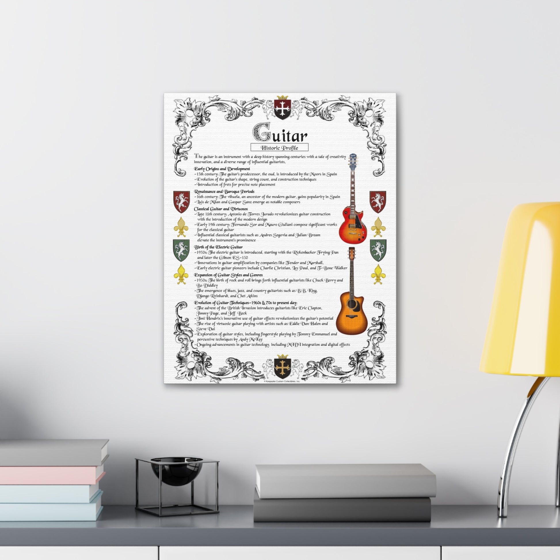 Uplift your music room, parlor, den, or home office decor by highlighting your passion for guitars with one of our commemorative Guitar Historic Profiles. Each Historic Profile displays the earliest recorded origins, key milestones, dates, notable accomplishments, and influential persons relative to the creation, development, and advancement of the guitar. Encompassed with a colorful Heraldic border, these stylish Historic Profiles are printed on a white, top-quality, 1.25" box frame canvas gallery wrap. Each canvas wrap is made with a finely textured, artist-grade cotton substrate which helps reproduce each Historic Profile in outstanding clarity and detail. Available in multiple sizes, these closed-back canvases are built with a patented, solid support face and are sure to be a popular conversation piece