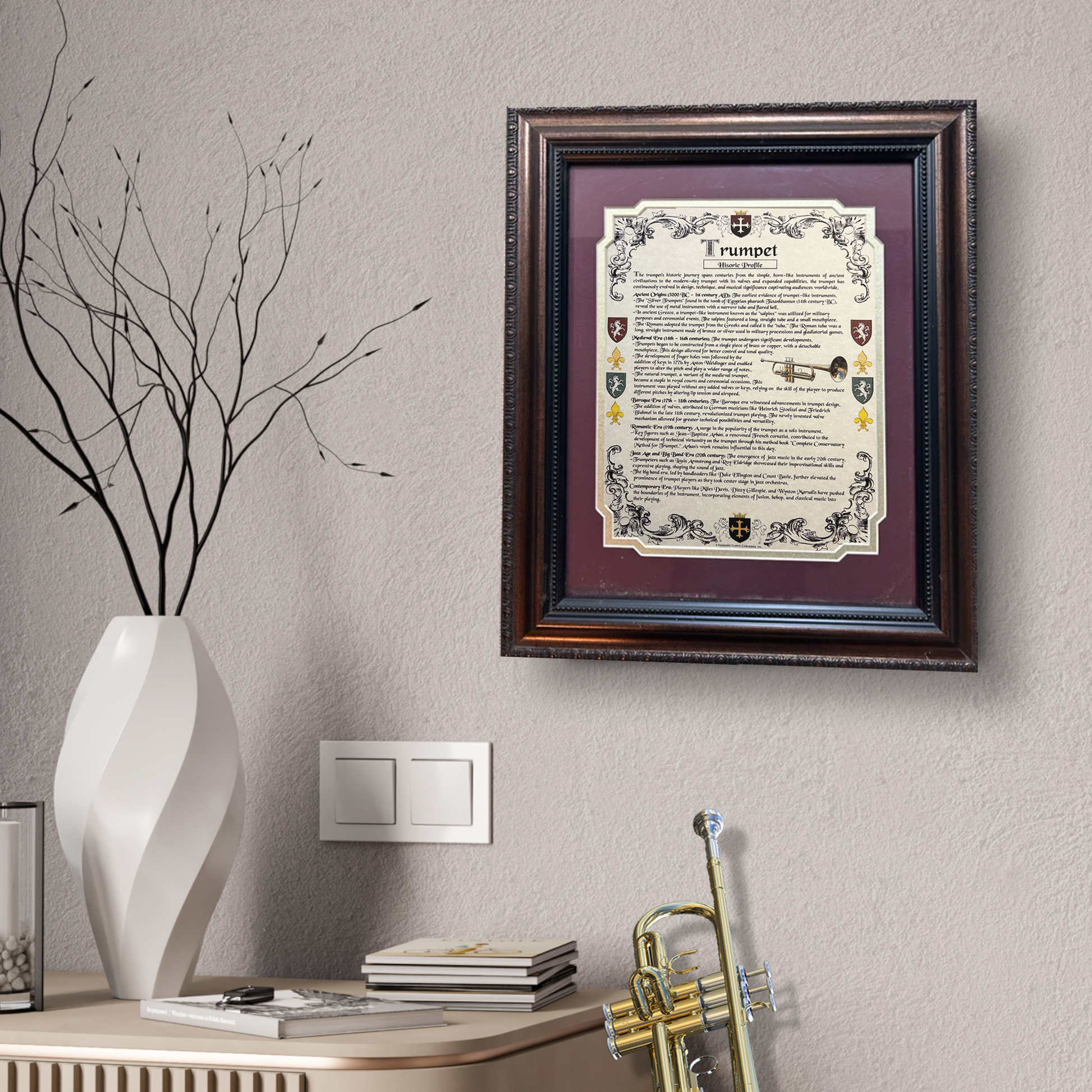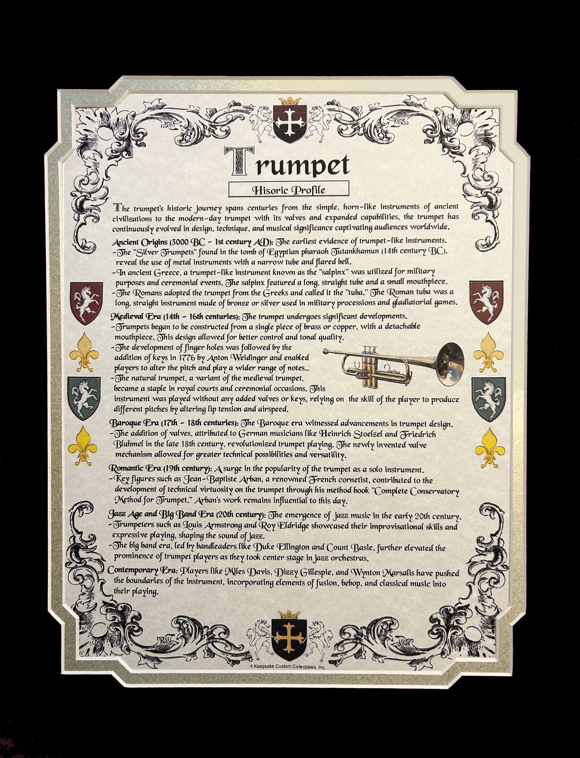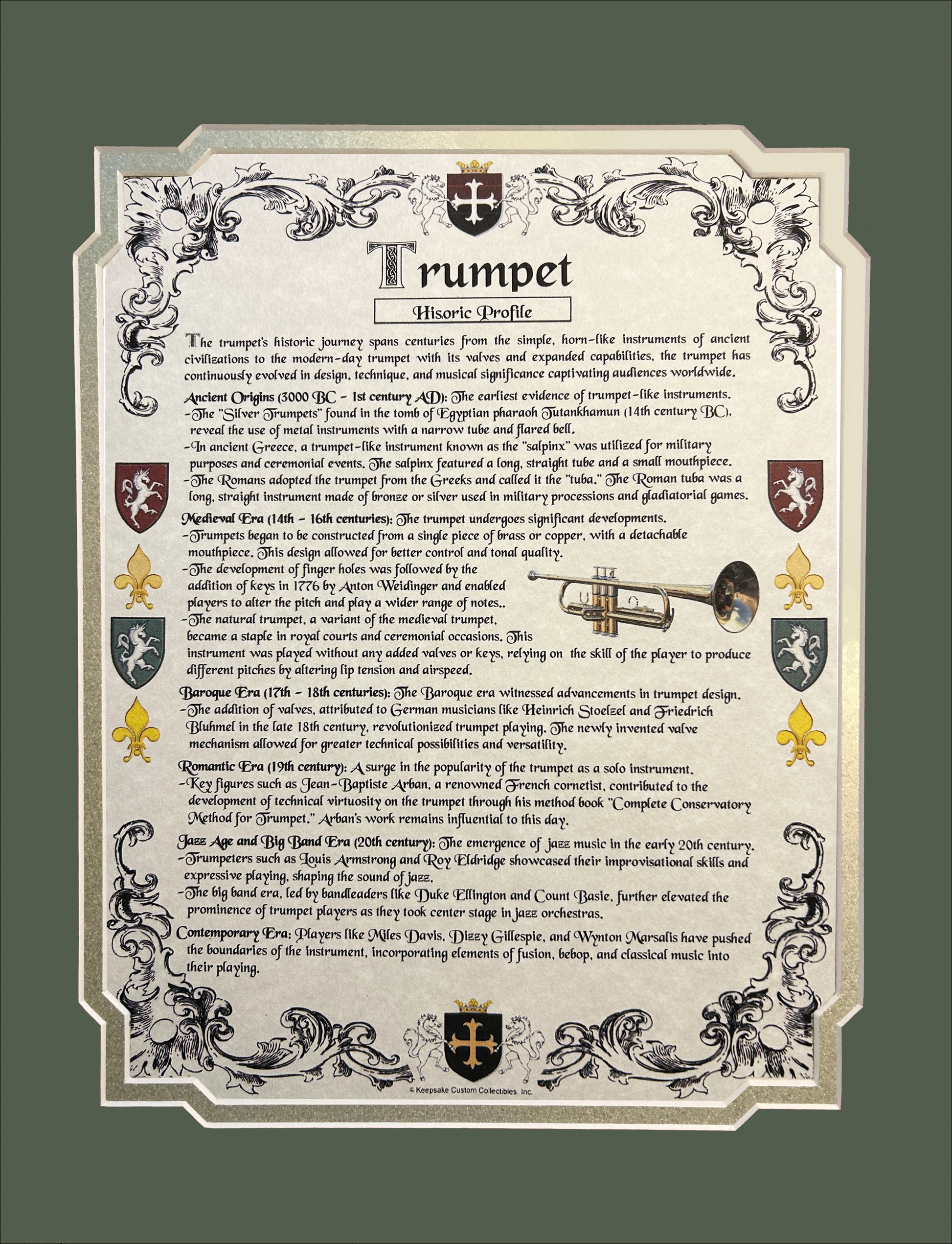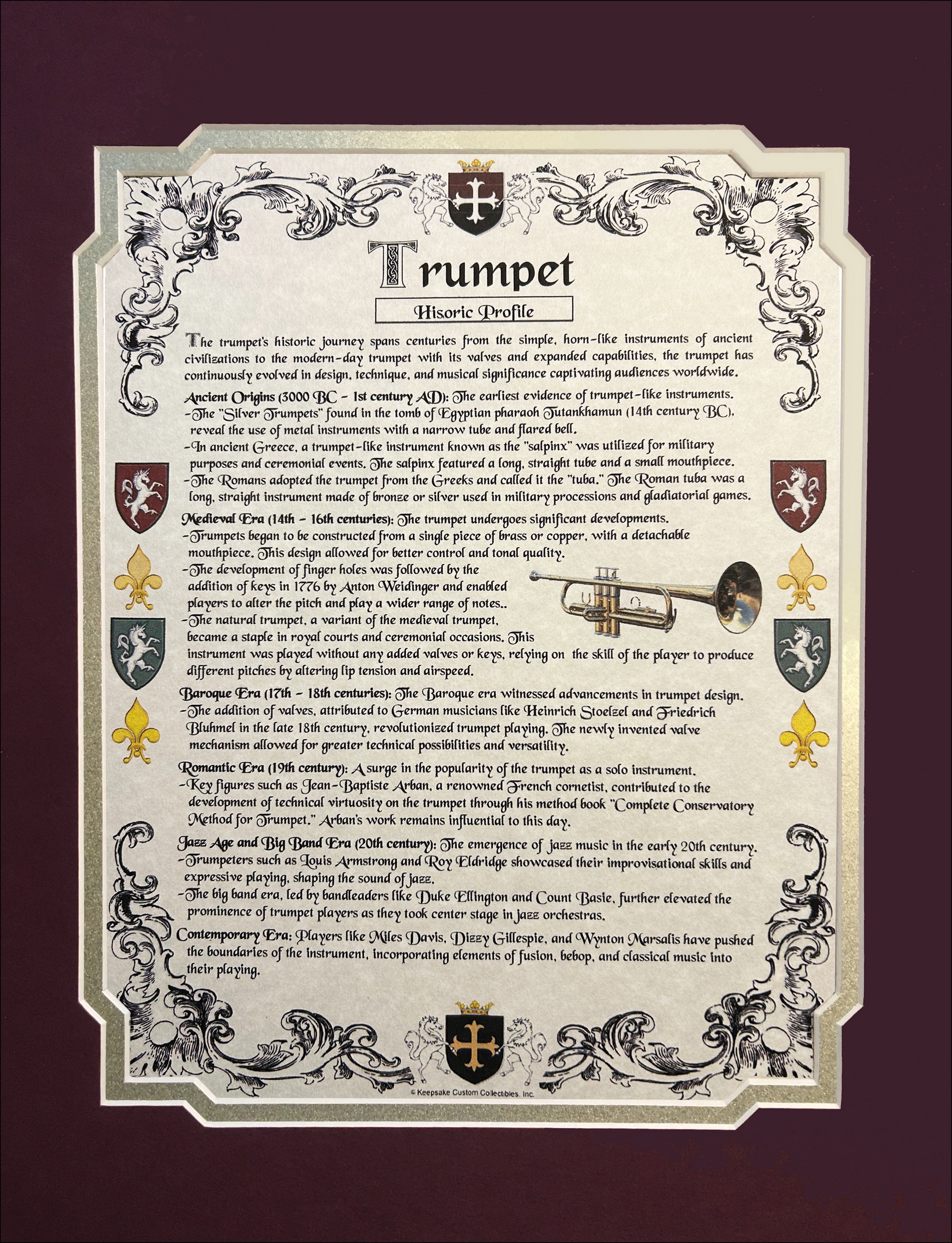 Uplift your music room, parlor, den, or home office decor by highlighting your passion for the drums with one of our commemorative Trumpet Historic Profiles Ready For Framing. Each Historic Profile displays the earliest recorded origins, key milestones, dates, notable accomplishments, and influential persons relative to the creation, development, and advancement of the trumpet. Encompassed with a colorful Heraldic border, these stylish Historic Profiles are printed on a ivory parchment stock and come with 1 die-cut mat and backerboard ready to place in your favorite frame. (FRAME IS NOT INCLUDED)