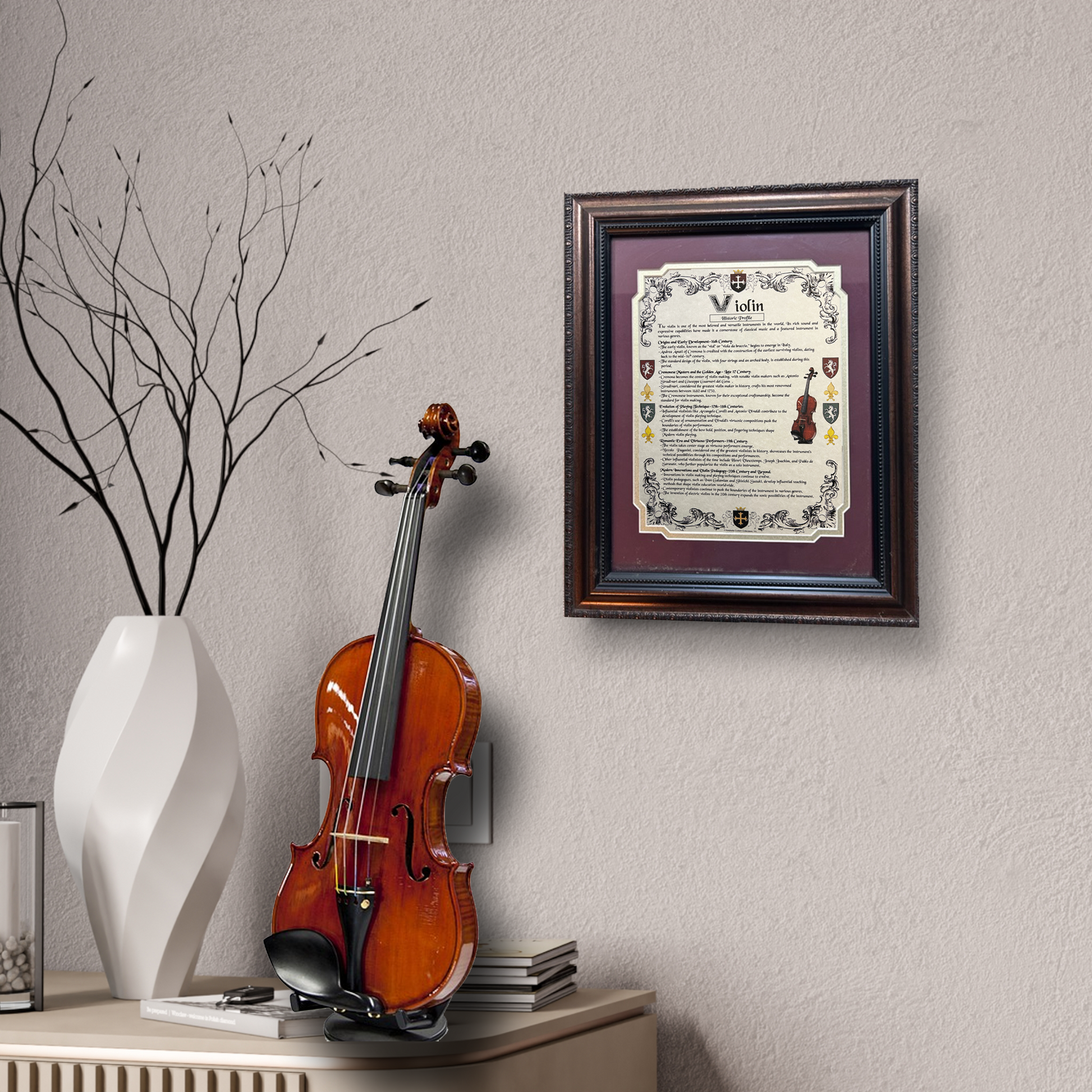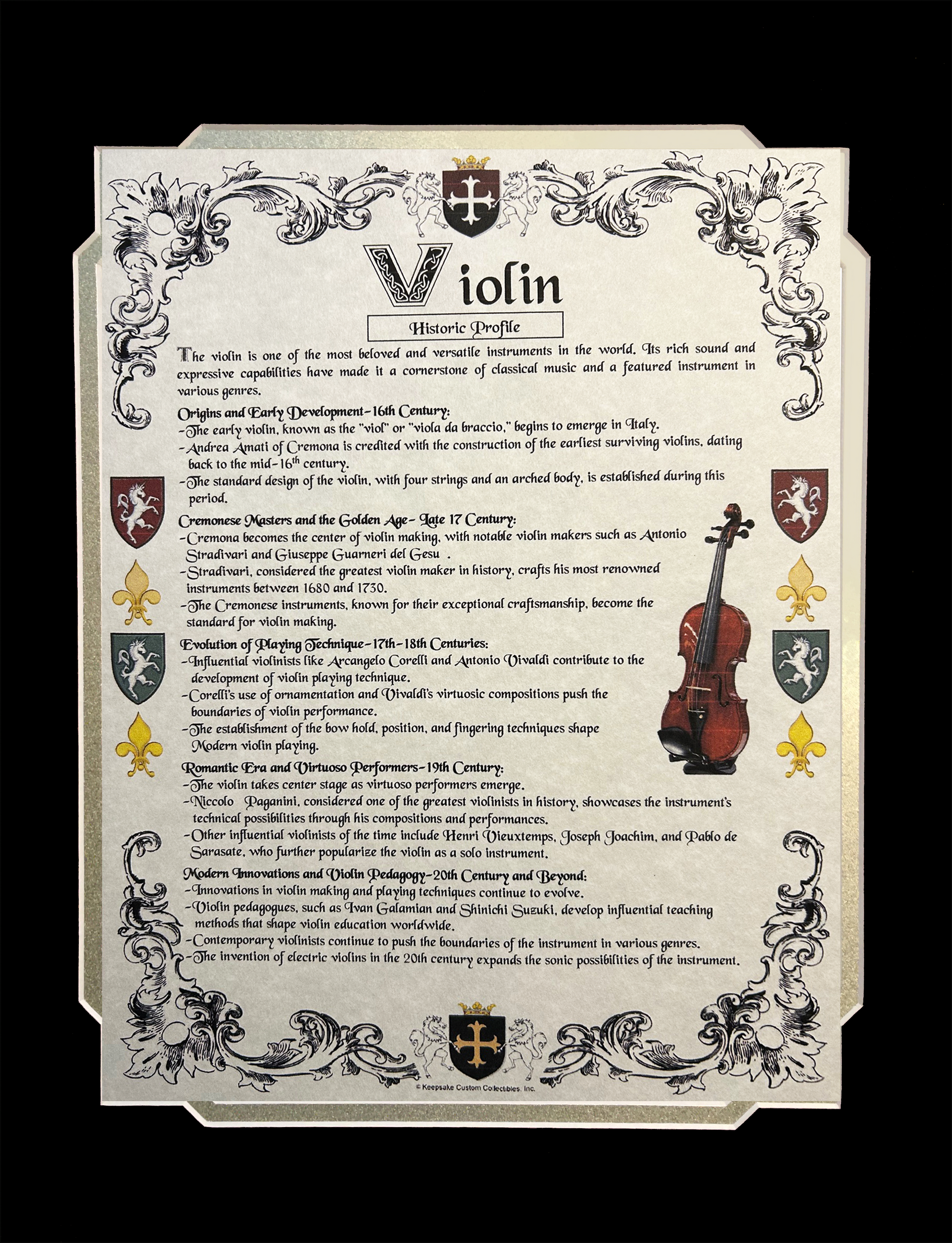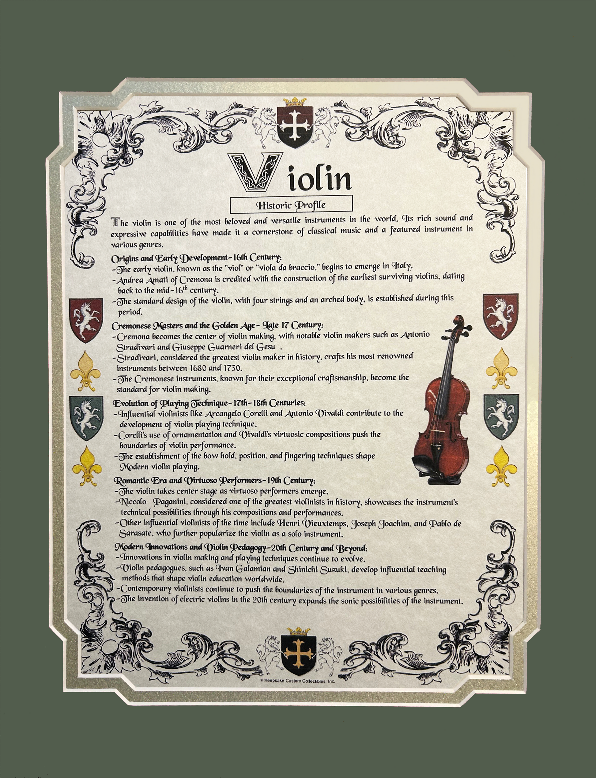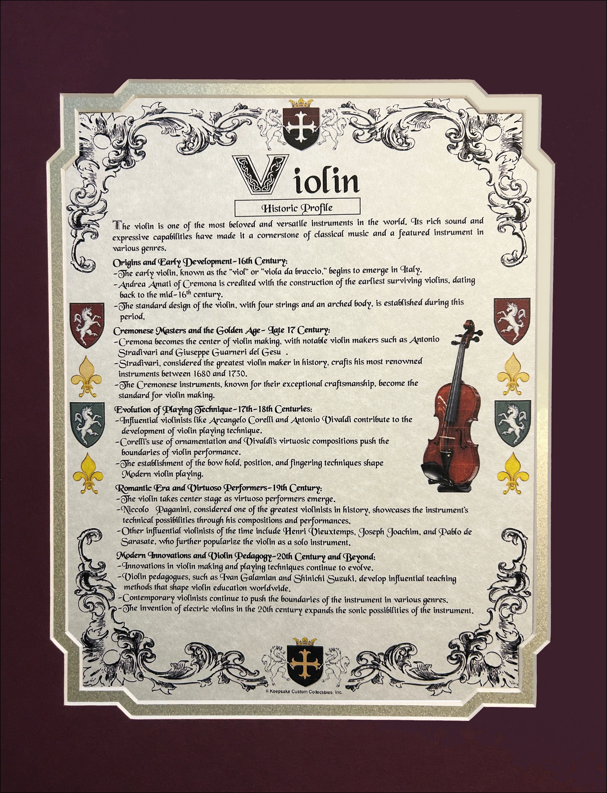 Uplift your music room, parlor, den, or home office decor by highlighting your passion for the drums with one of our commemorative Violin Historic Profiles Ready For Framing. Each Historic Profile displays the earliest recorded origins, key milestones, dates, notable accomplishments, and influential persons relative to the creation, development, and advancement of the violin. Encompassed with a colorful Heraldic border, these stylish Historic Profiles are printed on a ivory parchment stock and come with 1 die-cut mat and backerboard ready to place in your favorite frame. (FRAME IS NOT INCLUDED)