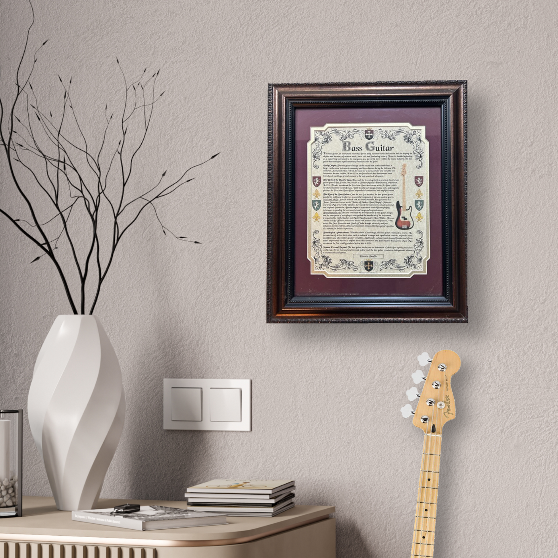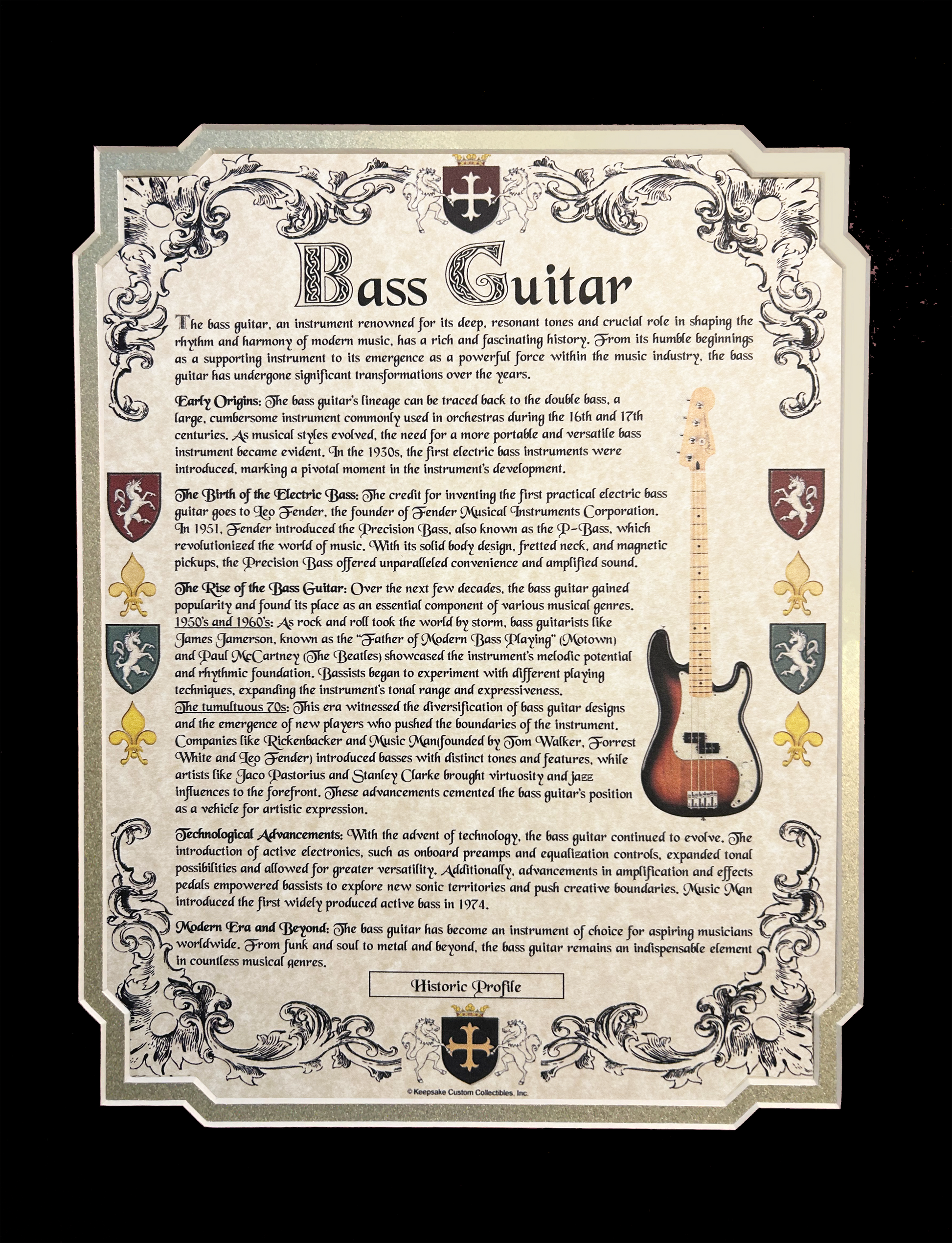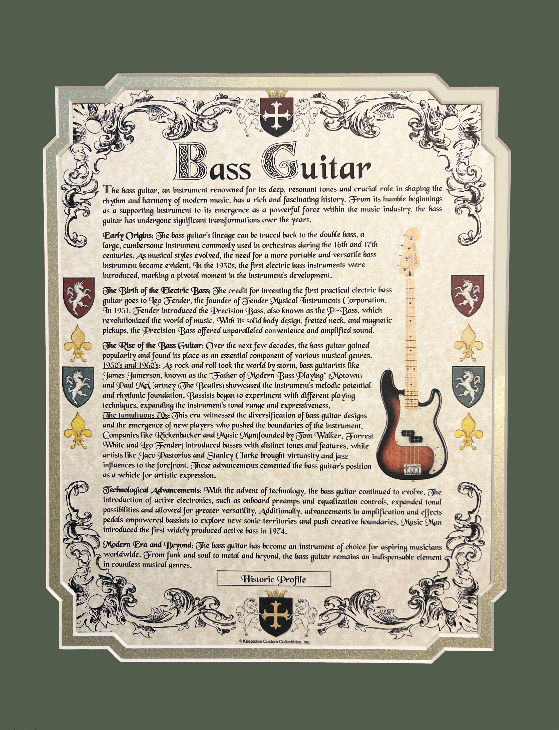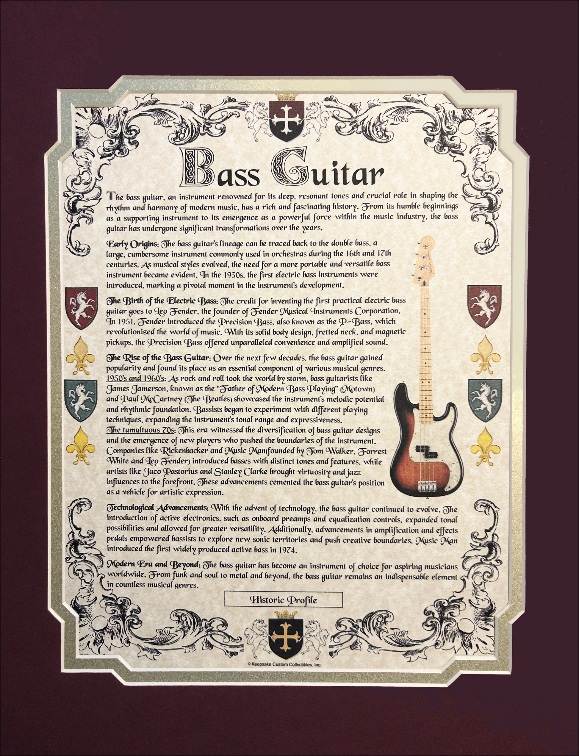 Uplift your music room, parlor, den, or home office decor by highlighting your passion for the bass guitar with one of our commemorative Bass Guitar Historic Profiles Ready For Framing. Each Historic Profile displays the earliest recorded origins, key milestones, dates, notable accomplishments, and influential persons relative to the creation, development, and advancement of the bass guitar. Encompassed with a colorful Heraldic border, these stylish Historic Profiles are printed on a ivory parchment stock and come with 1 die-cut mat and backerboard ready to place in your favorite frame. (FRAME IS NOT INCLUDED)