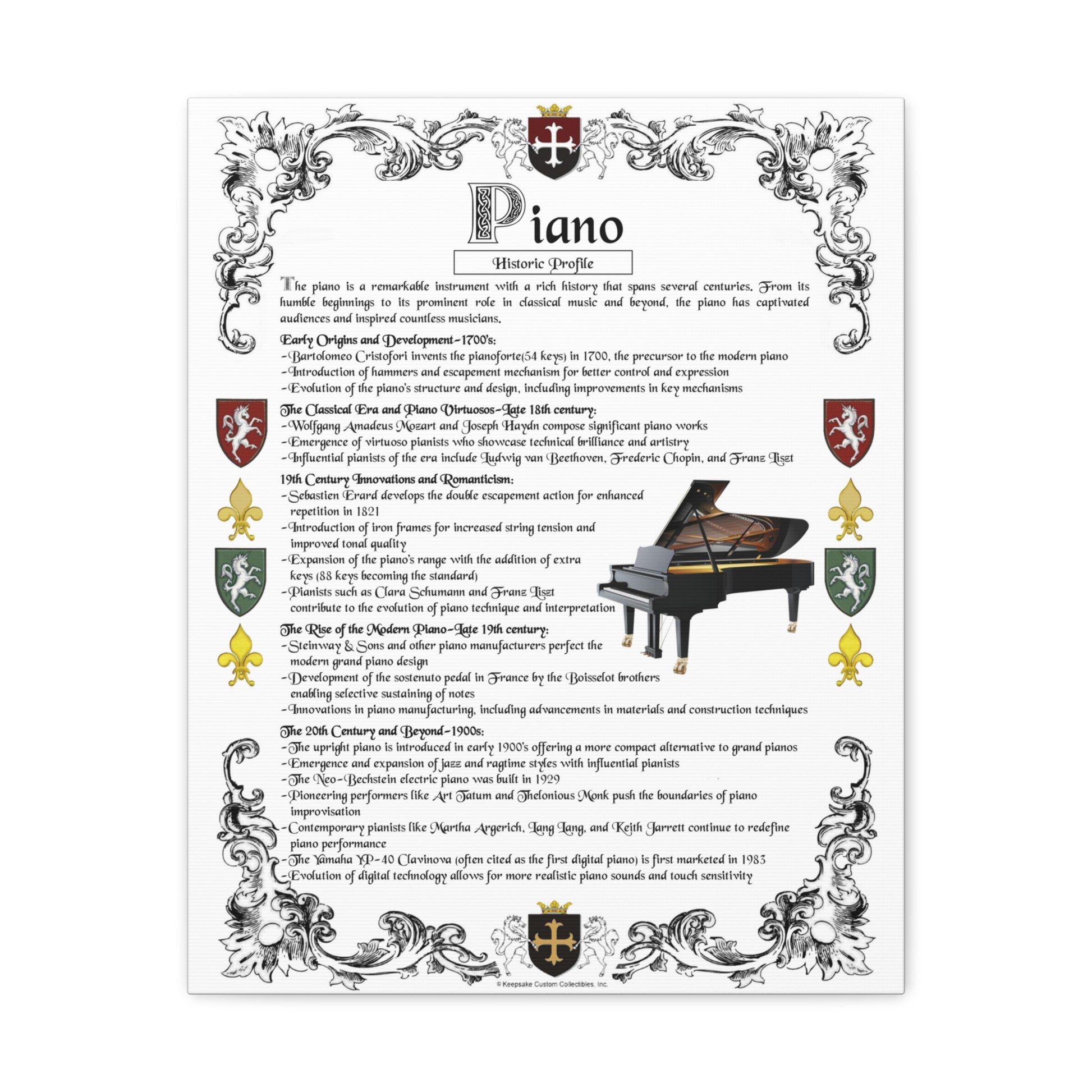 Uplift your music room, parlor, den, or home office decor by highlighting your passion for pianos with one of our commemorative Piano Historic Profiles. Each Historic Profile displays the earliest recorded origins, key milestones, dates, notable accomplishments, and influential persons relative to the creation, development, and advancement of the piano. Encompassed with a colorful Heraldic border, these stylish Historic Profiles are printed on a white, top-quality, 1.25" box frame canvas gallery wrap. Each canvas wrap is made with a finely textured, artist-grade cotton substrate which helps reproduce each Historic Profile in outstanding clarity and detail. Available in multiple sizes, these closed-back canvases are built with a patented, solid support face and are sure to be a popular conversation piece.