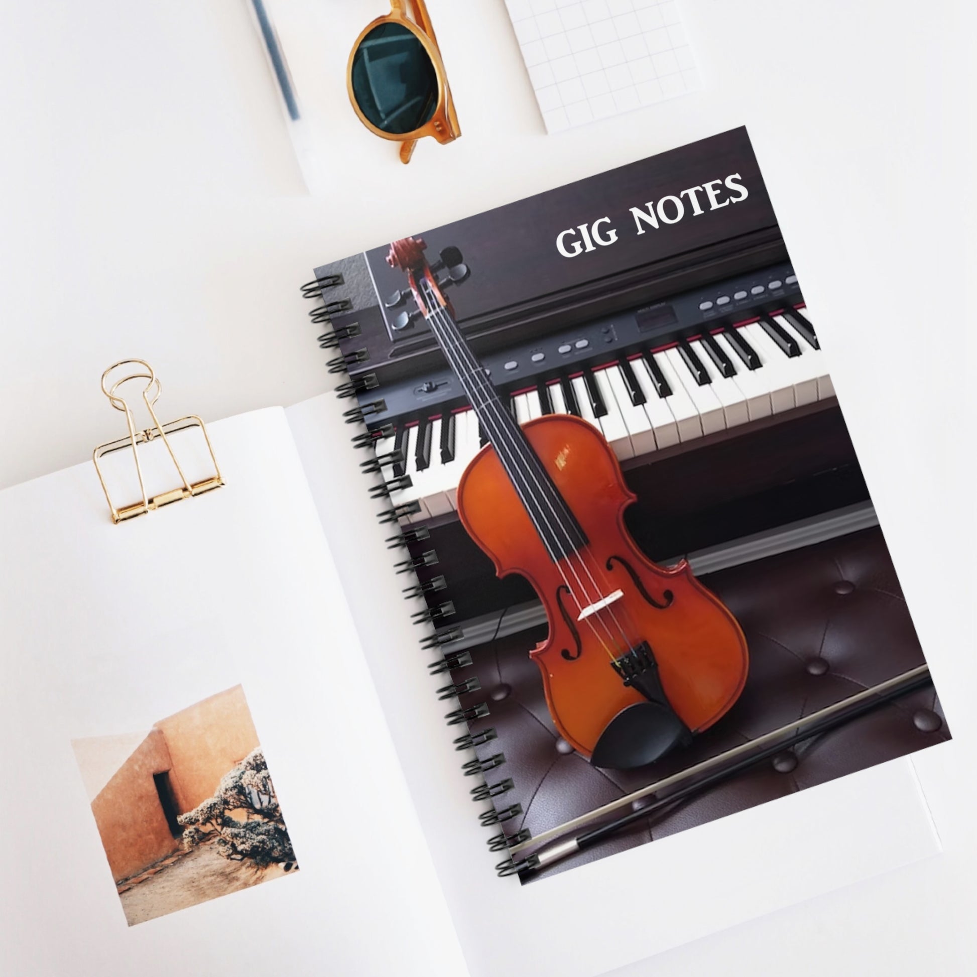 Every musician needs a compact notebook handy for jotting down set lists, band notes, new song chord progressions, gig dates or even to use as a journal. The "Gig Notes Notebook and Journal" is a 118 page spiral notebook with ruled line paper and is compact enough to fit perfect in your case, gig and gear bag or just to carry. The durable, instrument specific, printed cover makes the musician proud to carry it everywhere.